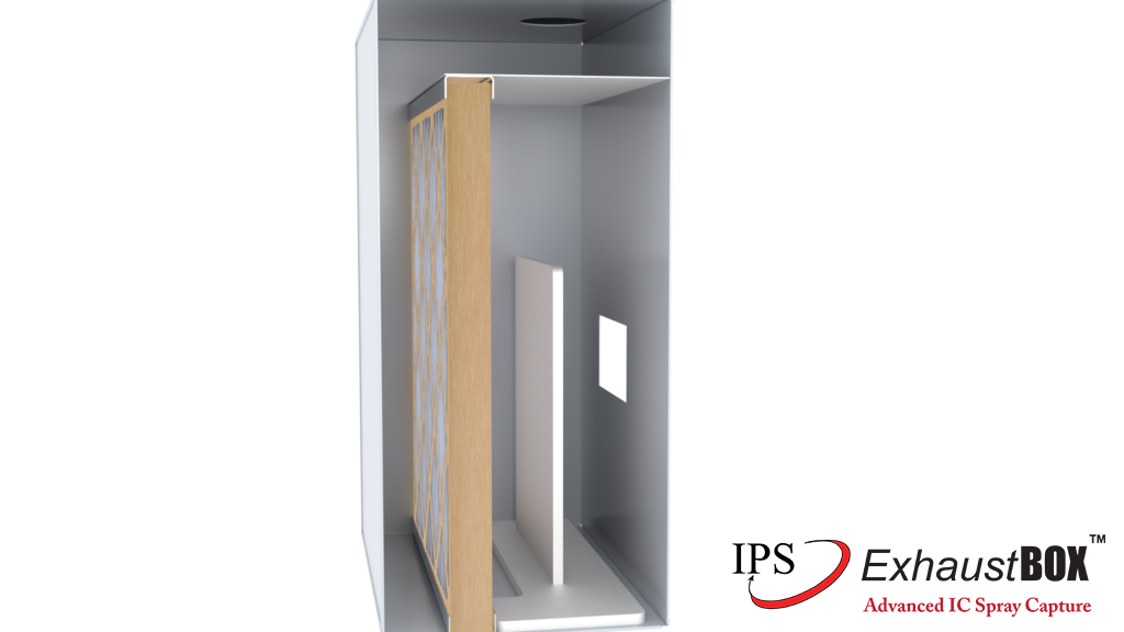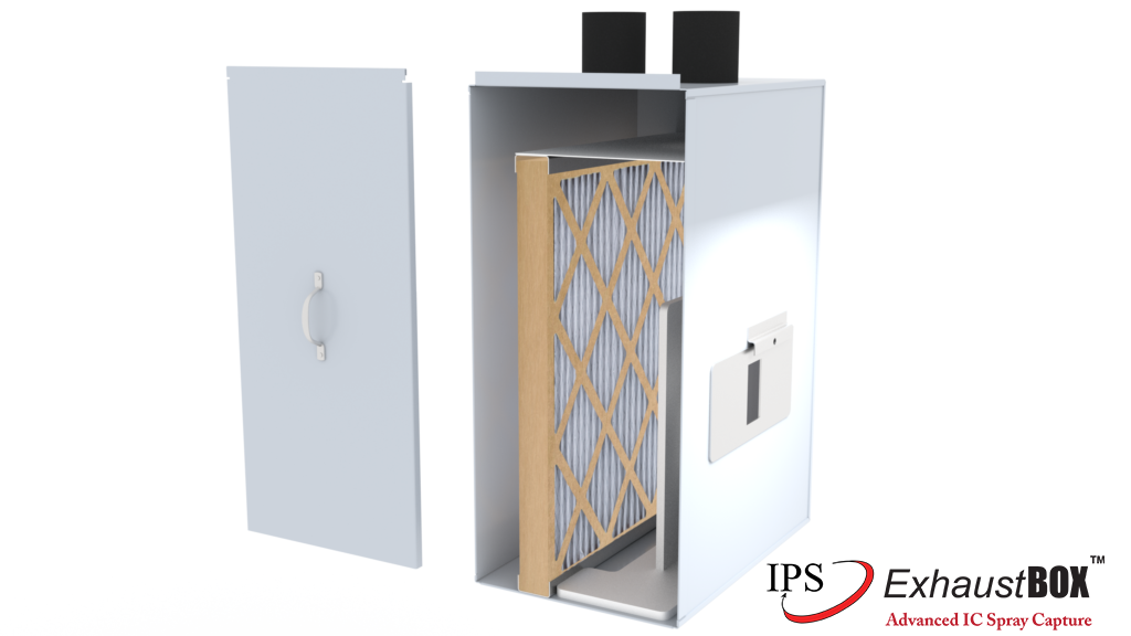 Introducing the IPS ExhaustBOX™ – the ultimate solution for maximizing IC over-spray capture. With its innovative design, this device slows down the airflow, allowing airborne particles to be easily collected at the deflection plate and removable filter. The ExhaustBOX™ is standard with the IPS CanSPRAY™ and is available as a retrofit on most standard IC Spray Machines.