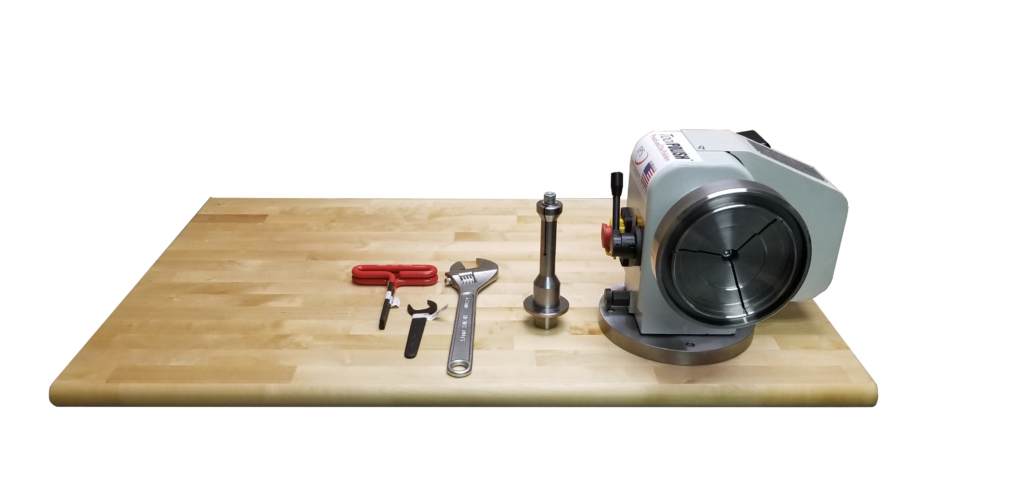 The IPS ToolPOLISH takes the manual polishing of punches and dies and provides a safe yet robust solution. ToolPOLISH uses the SafeCHUCK system to ensure that job site accidents are greatly reduced. The SafeCHUCK mounting system holds tooling in a manner that creates a snag-free environment. Tools are securely and safely held for the polishing process. ToolPOLISH combines a heavy duty lathe with a solid maple work surface with plenty of room to get the job done.